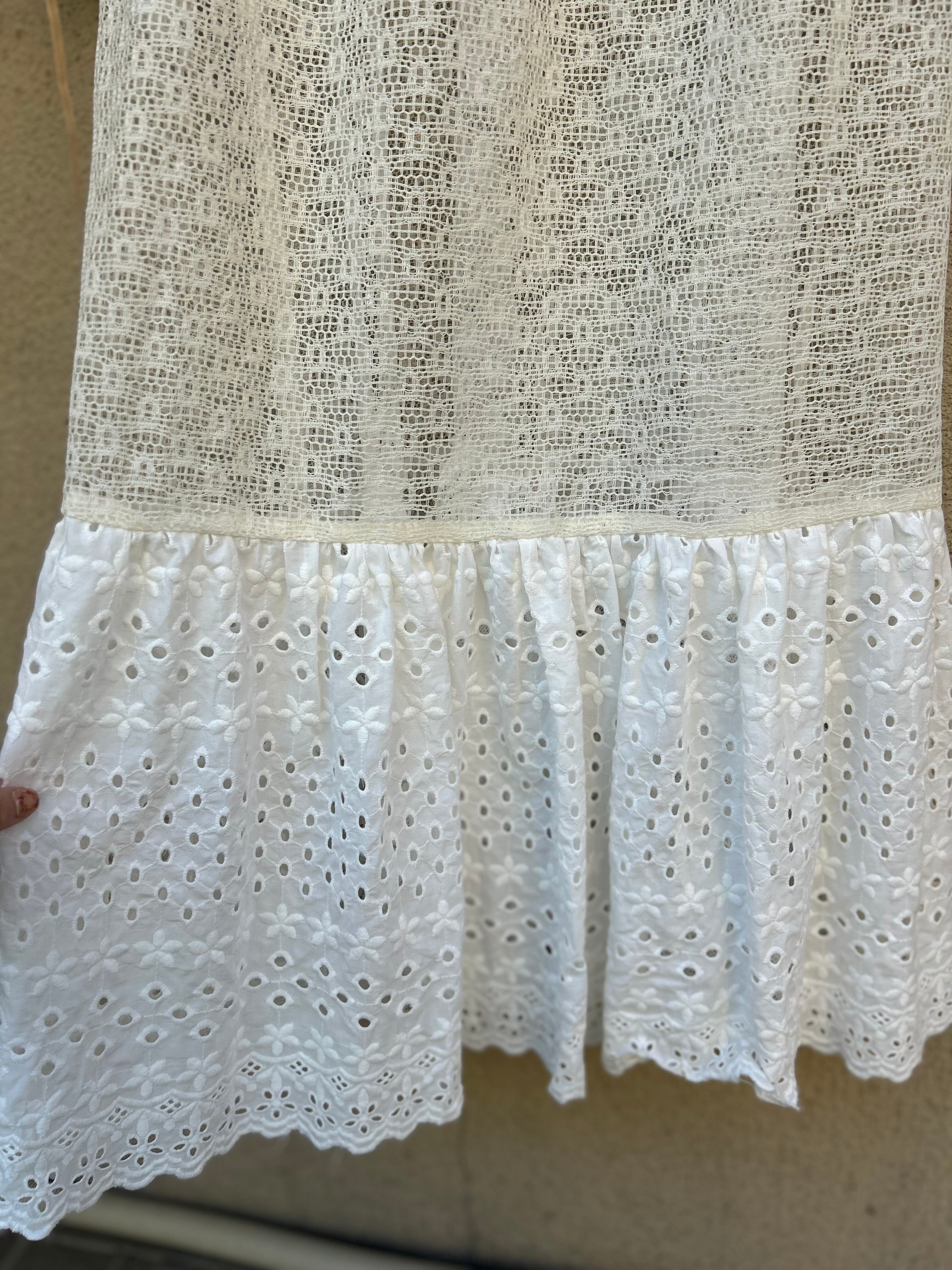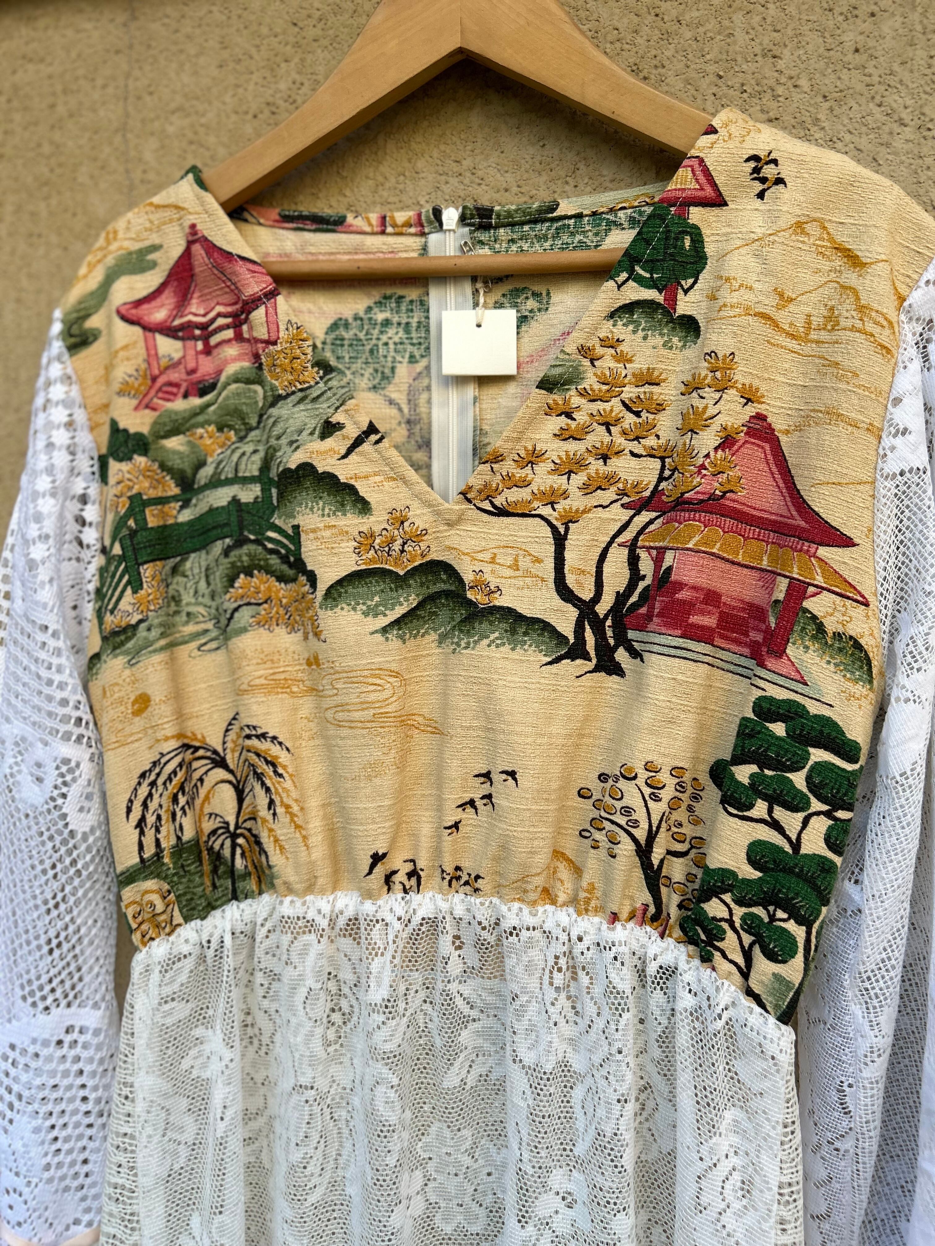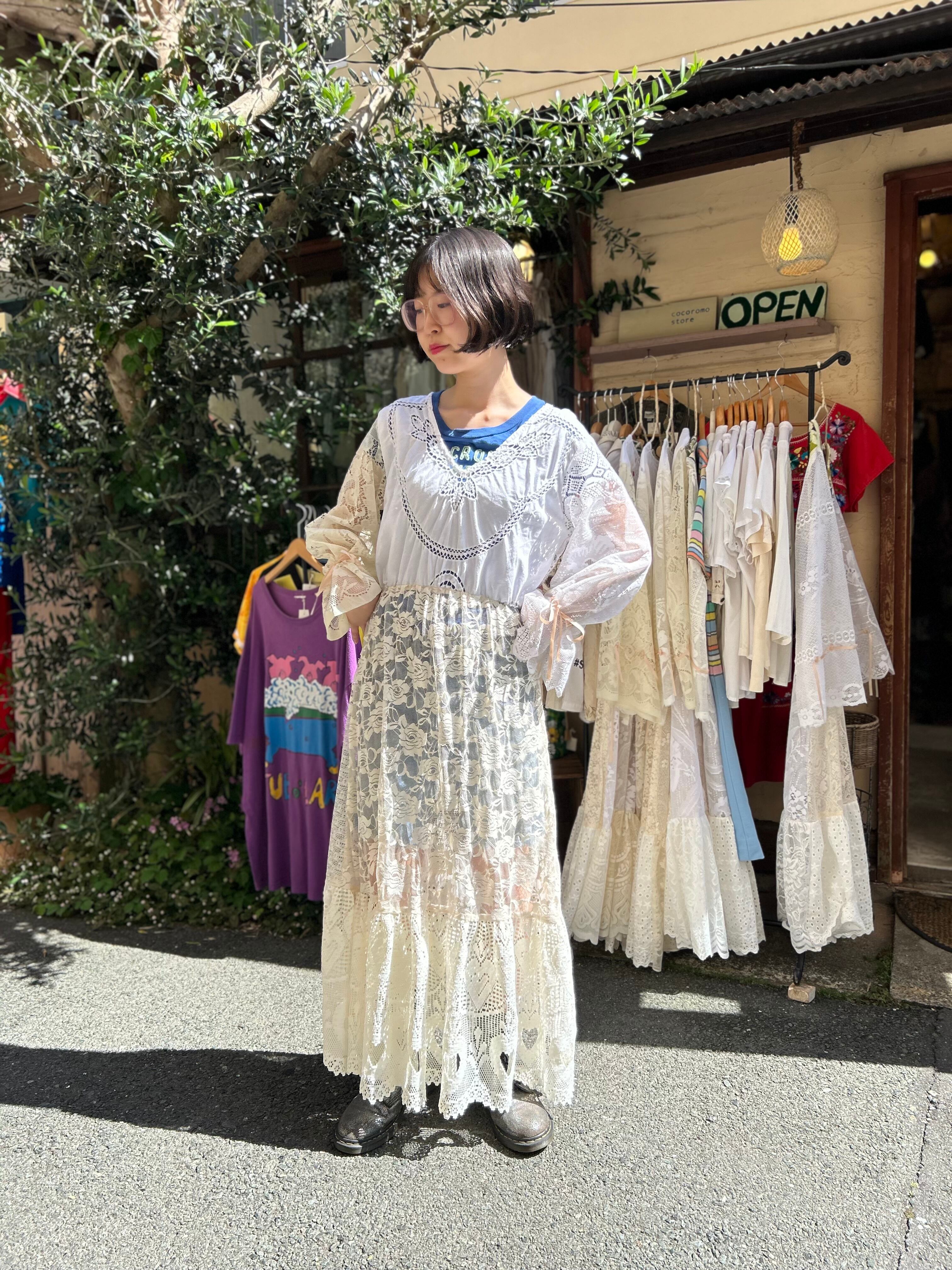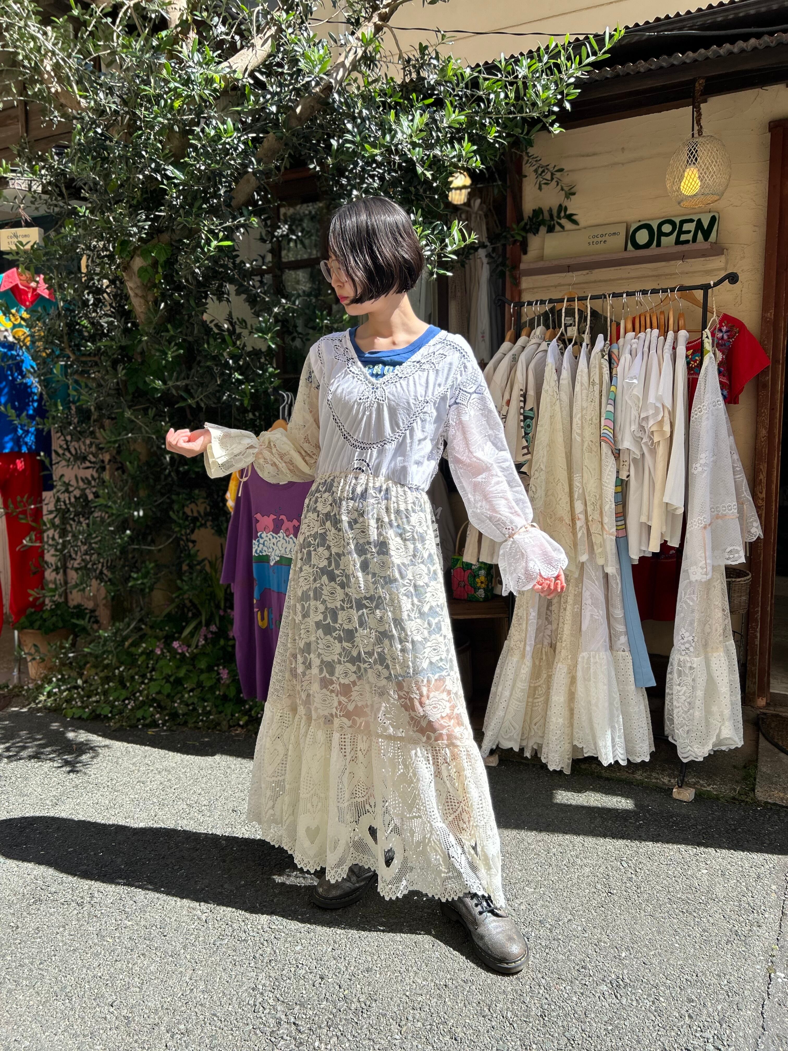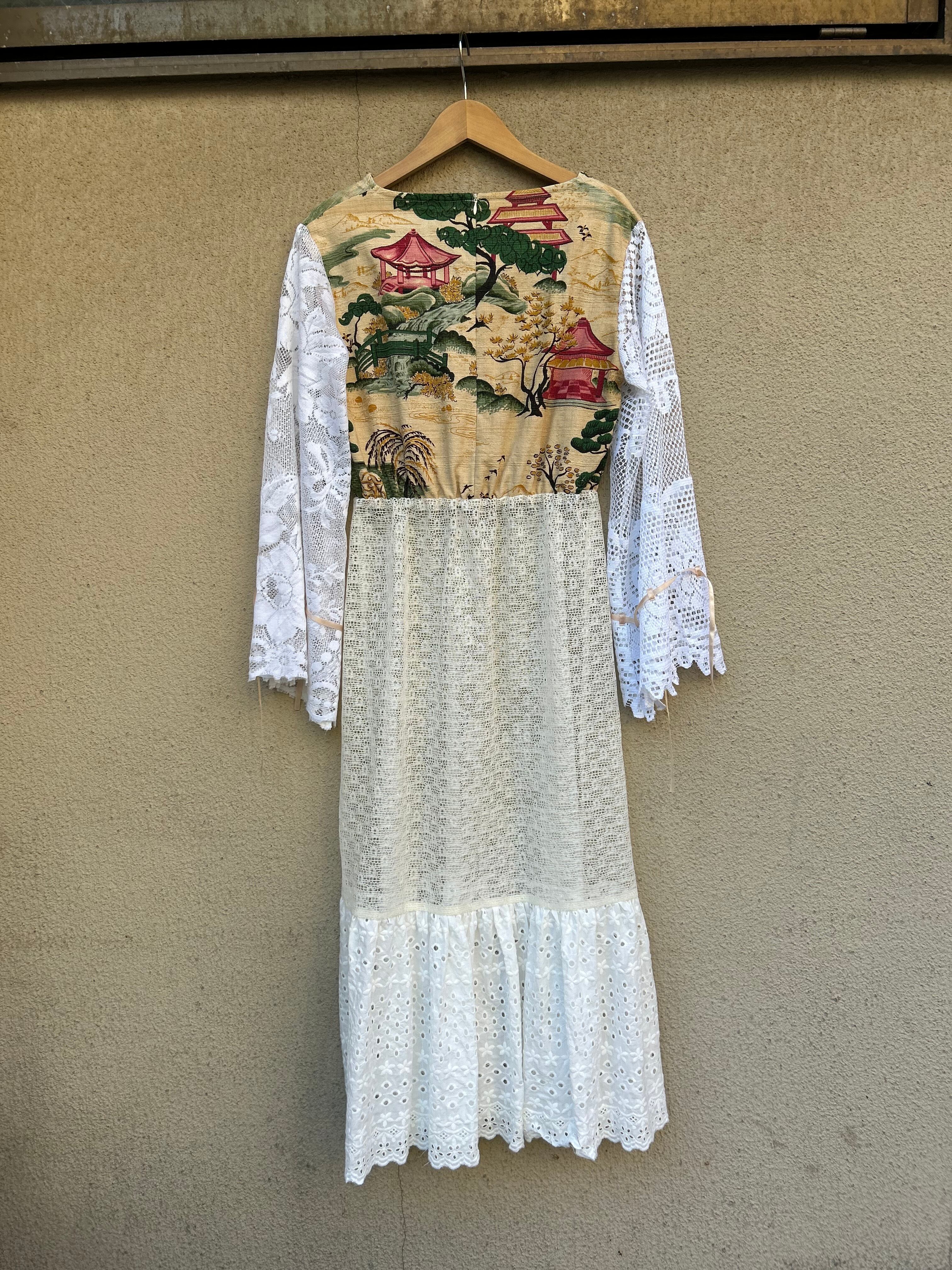 ヴィンテージのレースとカーテンを使ったオリジナルのリメイクワンピースです。